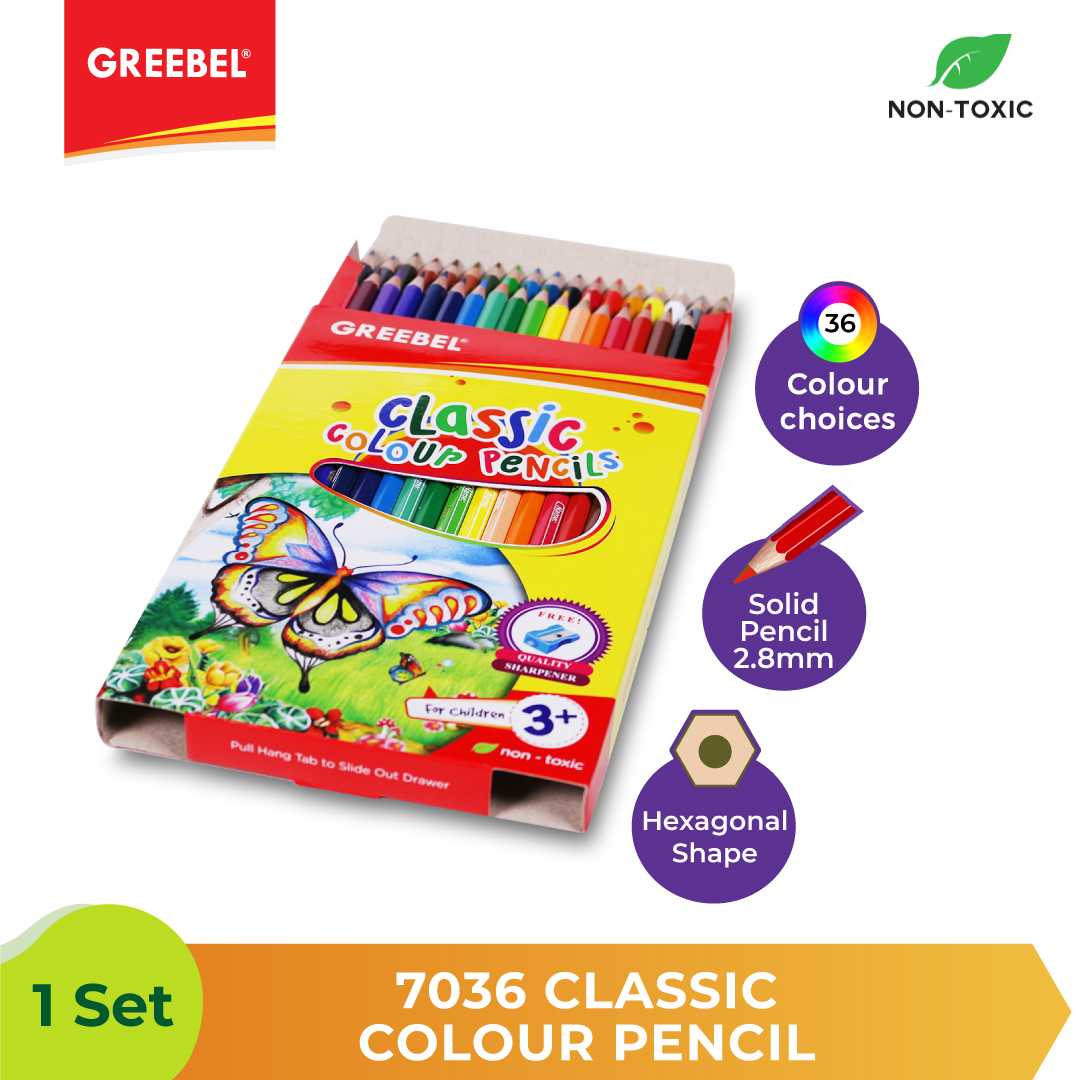 Produk pensil warna classic terdiri dari 12 half, 12, 24 dan 36 pilihan warna, Pensil classic 36 warna dilengkapi dengan rautan dalam setiap kemasan, Pensil warna classic berbentuk hexagonal seperti pensil pada umumnya, Lead pensil kokoh (2.8mm ), tidak mudah patah dan telah lulus uji toksisitas ( non toxic formula ) sehingga aman digunakan oleh anak-anak, Untuk mendapat warna yang cerah dan pekat cukup ditekan saat mewarnai, Media yang digunakan selain kertas ialah kanvas,kayu / stik es krim, Pensil warna tidak boleh diraut terlalu runcing karena bila terlalu runcing maka akan remuk / patah dibagian tengah lead yang diraut, Cara mewarnai yang benar dengan pensil warna adalah dengan tidak menarik garis warna panjang- panjang, cukup dengan garis pendek-pendek atau melingkar seperti membuat bulatan.