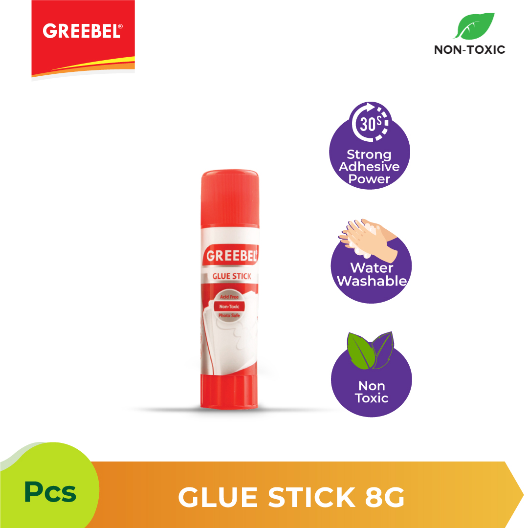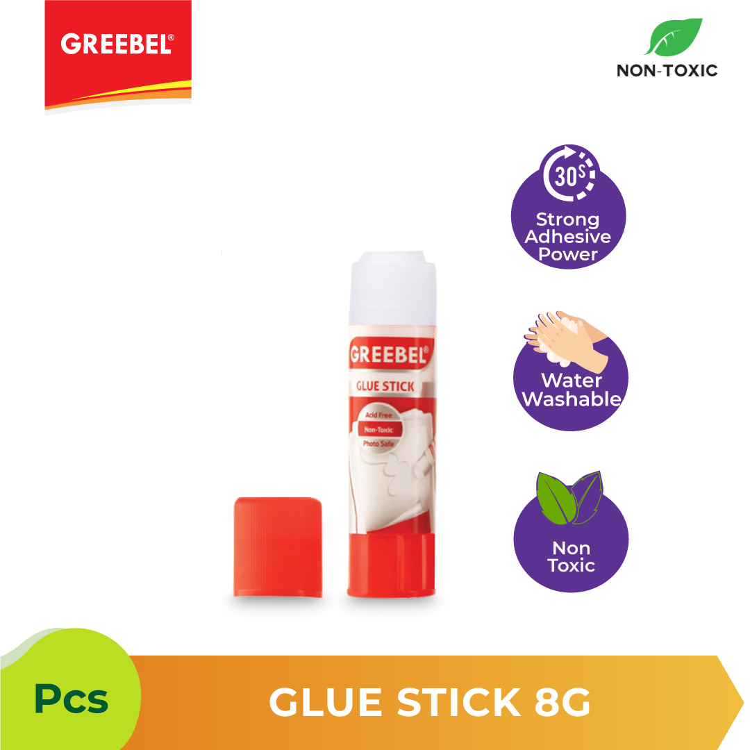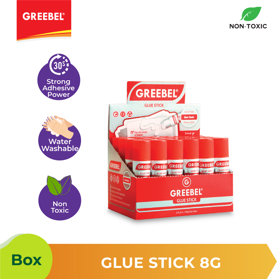 Glue stick Greebel terdiri dari ukuran 8 gr &15 gr ( 1 box = 24 pcs ), 21 gr & 40 gr ( 1 box = 12 pcs ). Glue stick digunakan untuk menempel kertas. Glue stick Greebel tidak berbau dan telah lulus uji toksisitas ( non toxic formula ) sehingga aman digunakan oleh anak-anak. Glue stick Greebel lebih kuat daya rekatnya dan lebih cepat kering saat digunakan ( 30 detik )